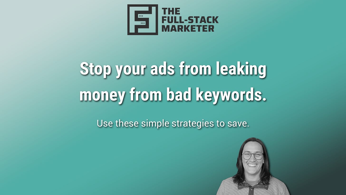 The Hidden Leaks in Your Google Ads BudgetStop wasting money on irrelevant clicks—here’s a smarter way to filter your search traffic.Virginia BuechelJul 30, 2025∙ PaidShareLet’s Talk About LeaksRunning a Google Search campaign without negative keywords is like trying to fill a leaky bucket.No matter how good your ad copy or landing page is, you’ll waste money on people…This post is for paid subscribersSubscribeAlready a paid subscriber? Sign inPreviousNext